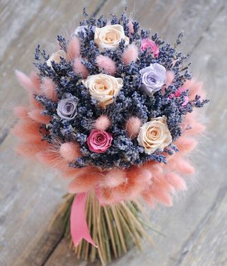 Очаровательный букет для любого праздника близким и родным. Идеальное поздравление. Роза можно будет потом срезать а лаванда и лагурус останутся у обладательницы до года.