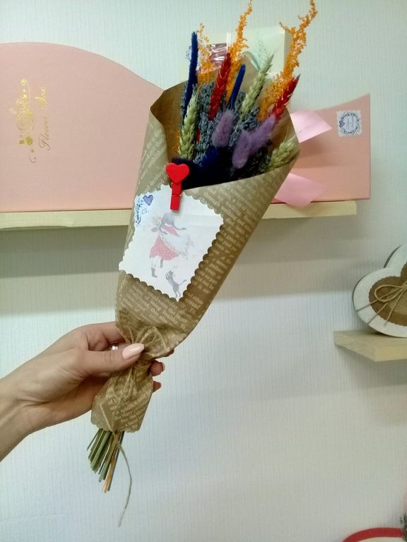 Букет очаровашка) подойдет для признания, для поздравления с днем рождения, для любого повода. Добавить можно любые живые цветы (пионовидные розы, пионы, пионовидные тюльпаны, тюльпаны, кенийские розы, герберы, ромашки). Прекрасно впишеться в любой интерьер. Срок жизни 1 год.