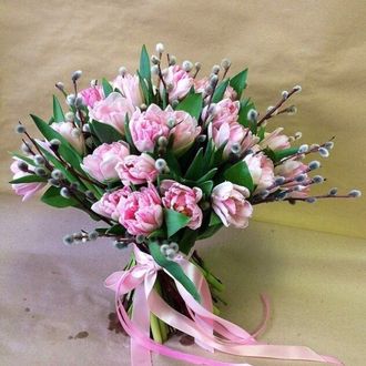 Изумительный букет сочетание пионовидных тюльпанов и вербы смотрится очень стильно и эстетично. Идеально подойдет для любого праздника и торжества. Цвет ленты может меняться по согласованию.
