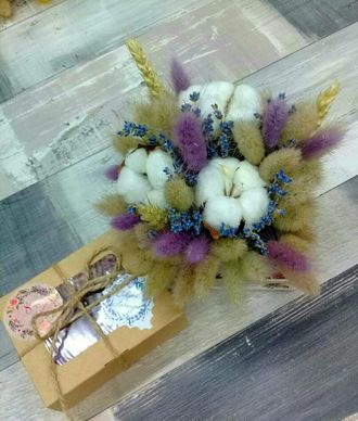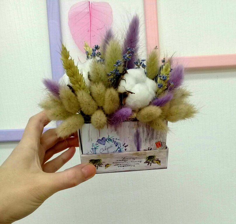 Милашка композиция в коробочке прованс. Украсит любой праздник и будет радовать свою хозяйку красотой. В доп. подарок можно выбрать мыло ручной работы, мед, масло лаванды, саше. Срок жизни 1 год.